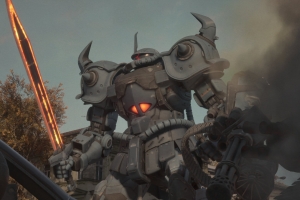 Awakening from a nightmare, Captain Solari finds the base in ruins. She later rallies weary mechanics to assemble Zaku II units from spare parts.